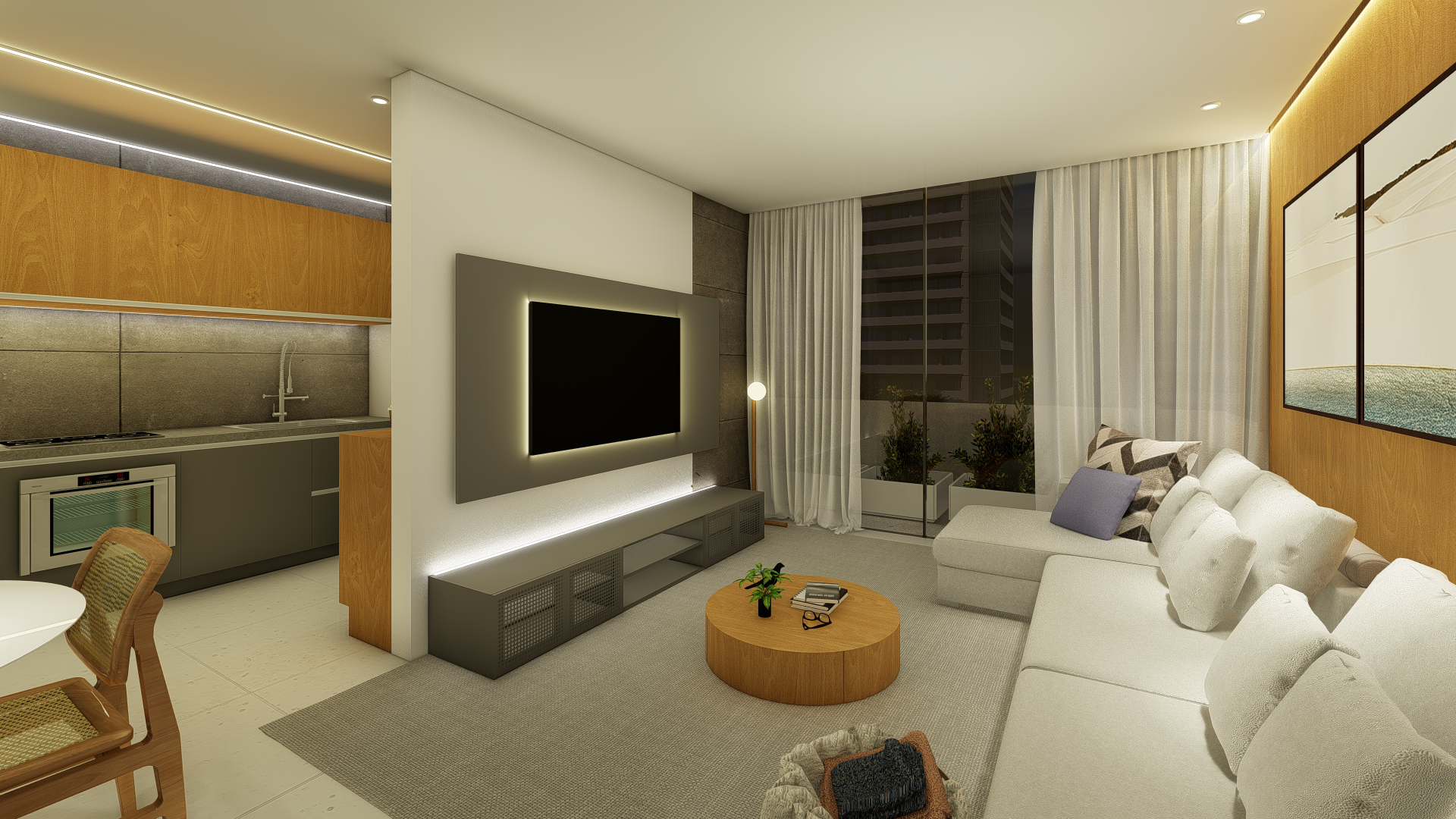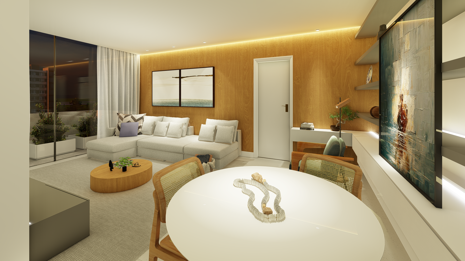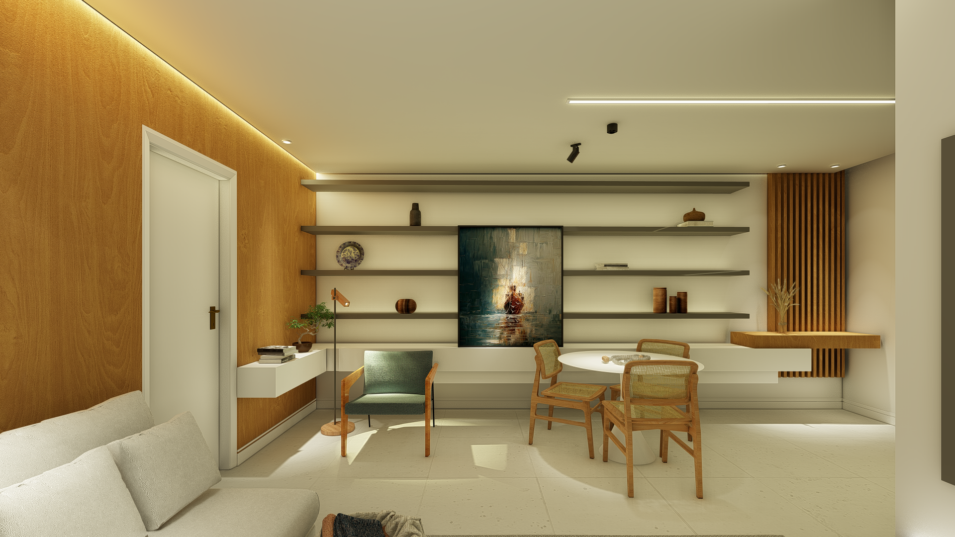 Utilizando grande parte da decoração já existente, nosso principal foco foi na redistribuição do espaço, na modernização da marcenaria e revestimentos. Fazer o rebaixo de gesso foi necessário por conta da iluminação embutida, tendo em conta que tínhamos apenas iluminação central nos ambientes.