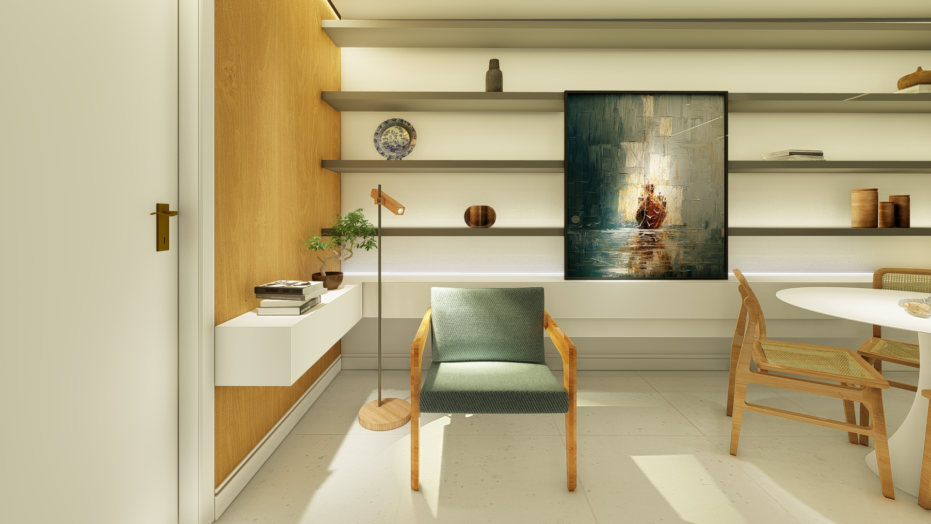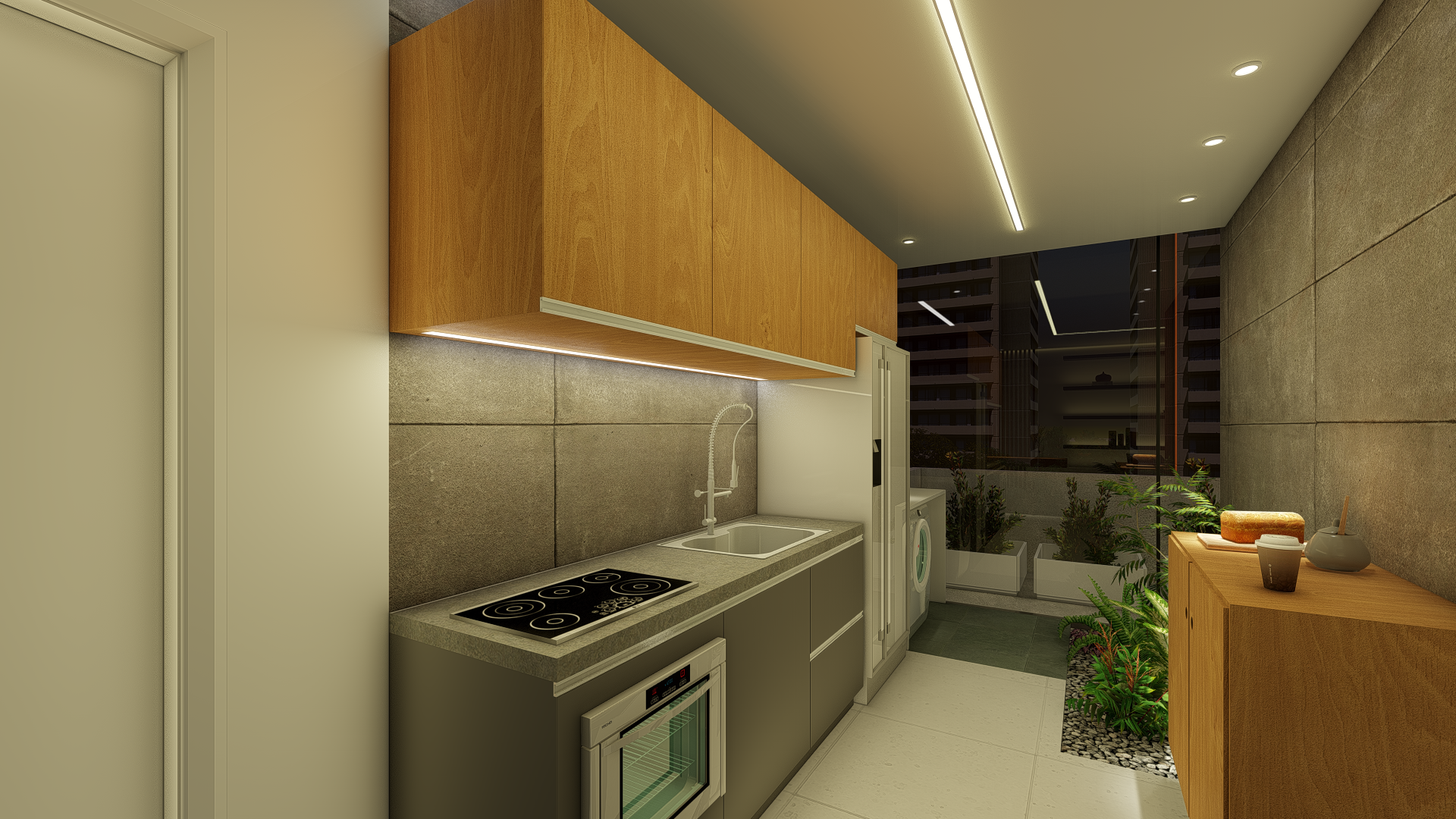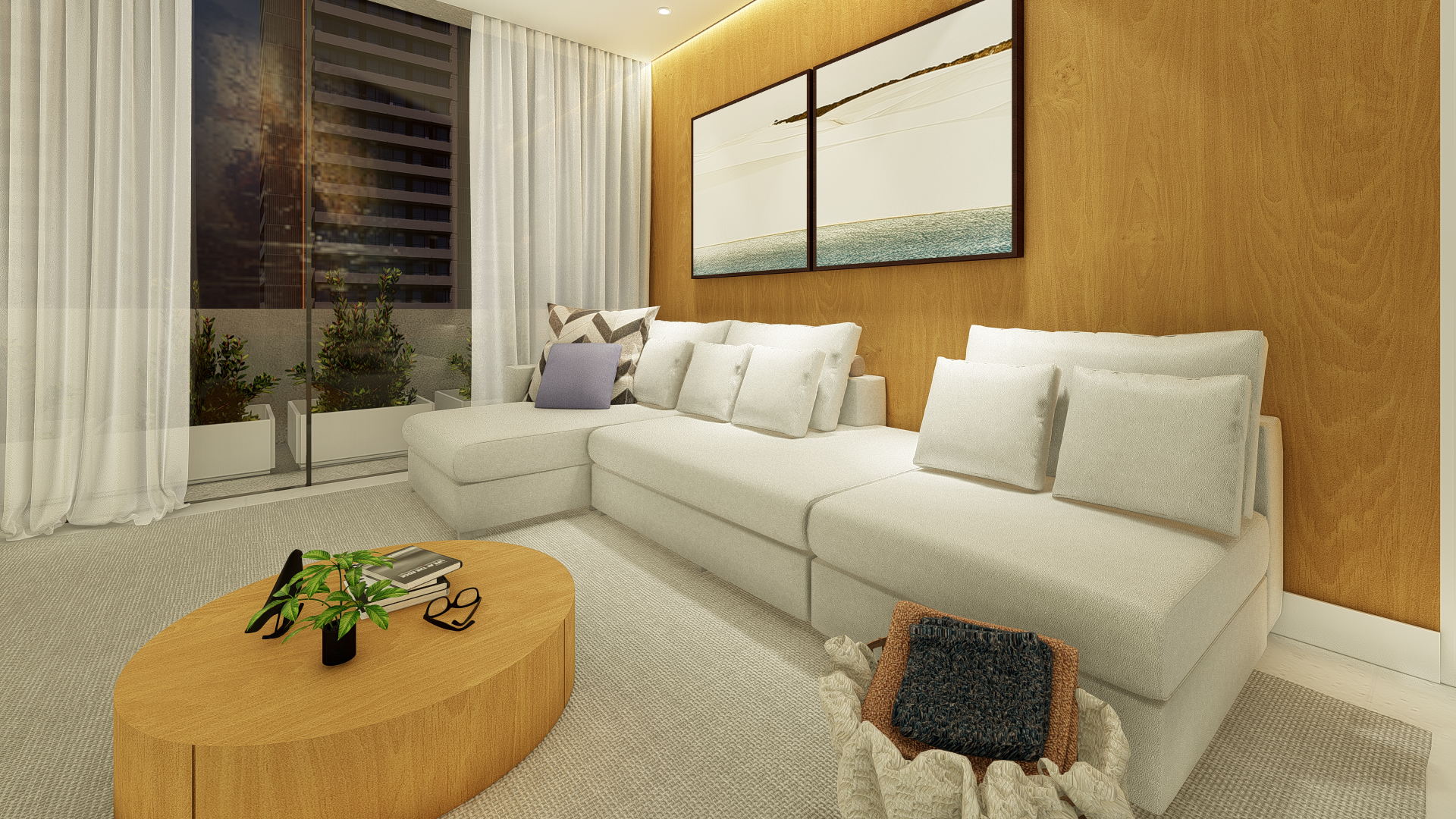 Utilizando grande parte da decoração já existente, nosso principal foco foi na redistribuição do espaço, na modernização da marcenaria e revestimentos. Fazer o rebaixo de gesso foi necessário por conta da iluminação embutida, tendo em conta que tínhamos apenas iluminação central nos ambientes.