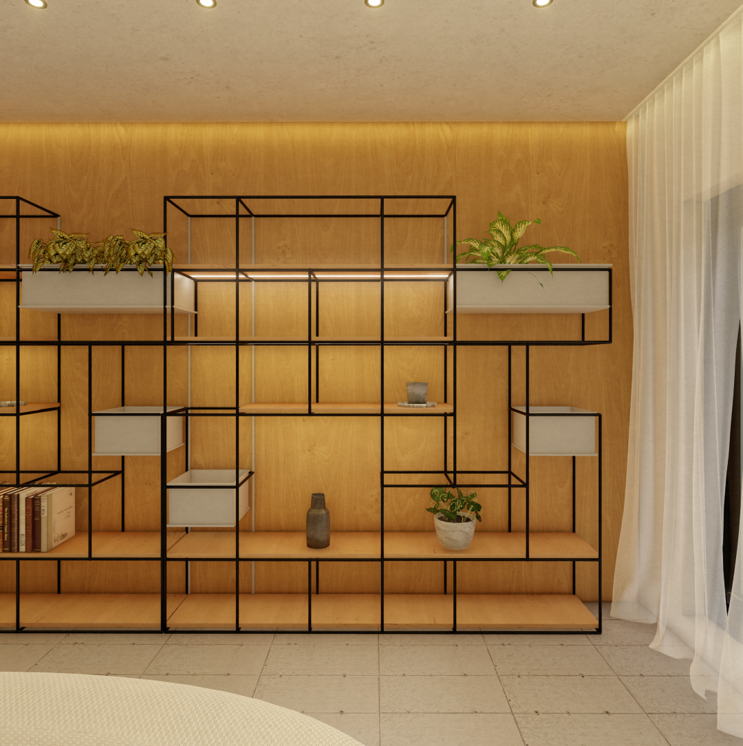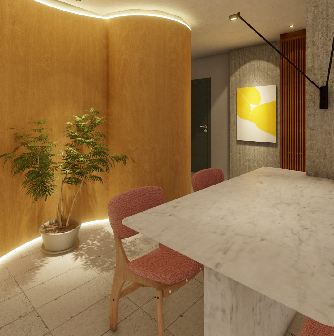 Contemporâneo moderno – Madeira, concreto, linho e arborização são elementos que compõem esse projeto que desenvolvemos para a Designer Luana. O objetivo foi fazer um ambiente mais puxado para o biofílico + iluminação quente com base indireta, com pouca iluminação central.