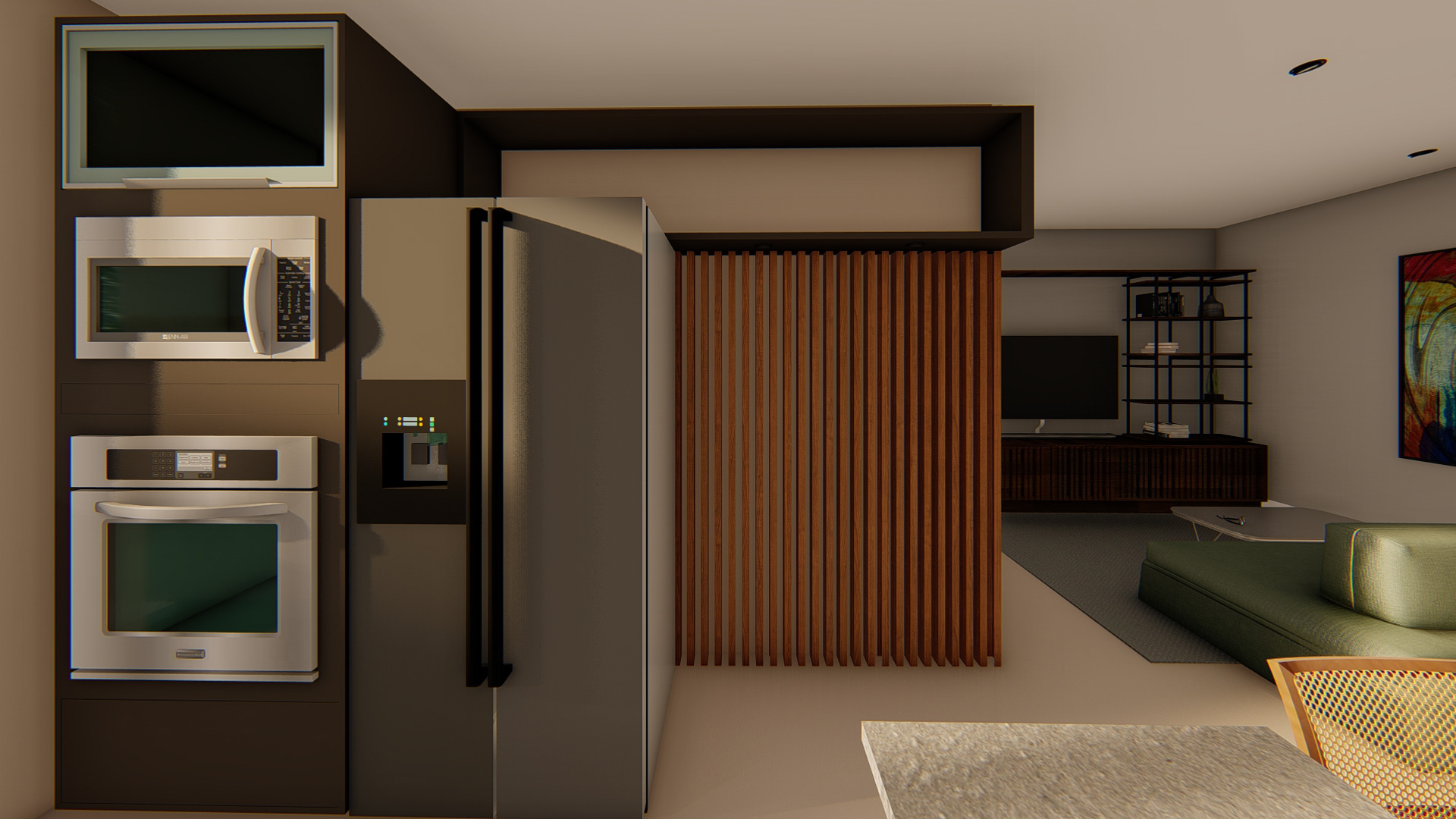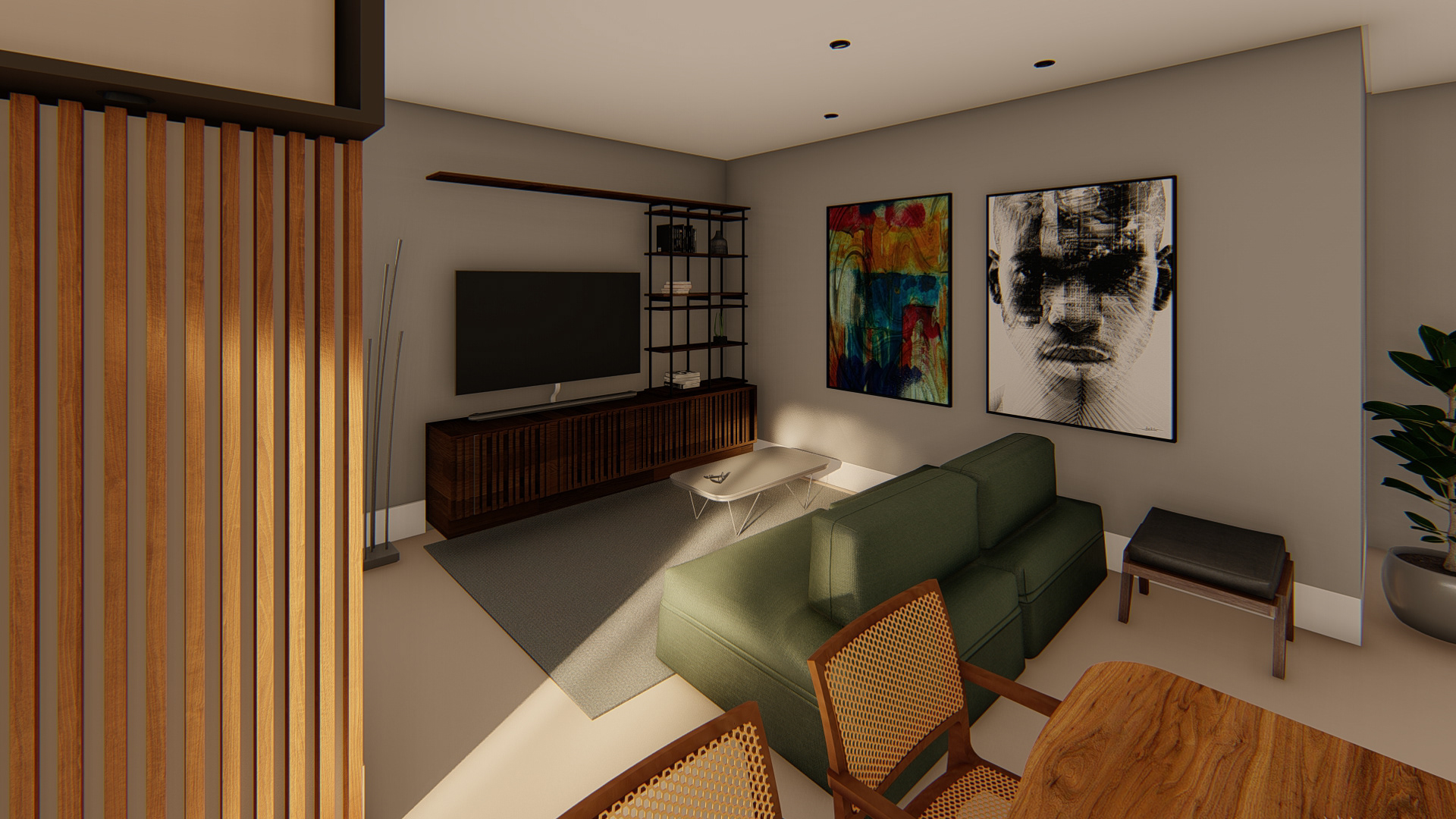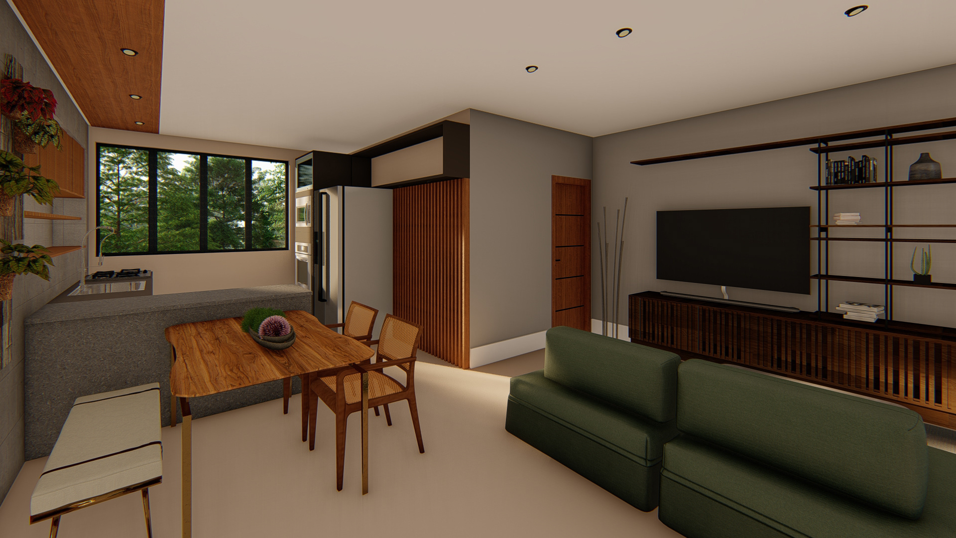 Apartamento planejado com salas e cozinha integrada – Contemporâneo, integramos sala e cozinha em prol de ganhar iluminação natural no ambiente (já que há apenas uma janela no ambiente).